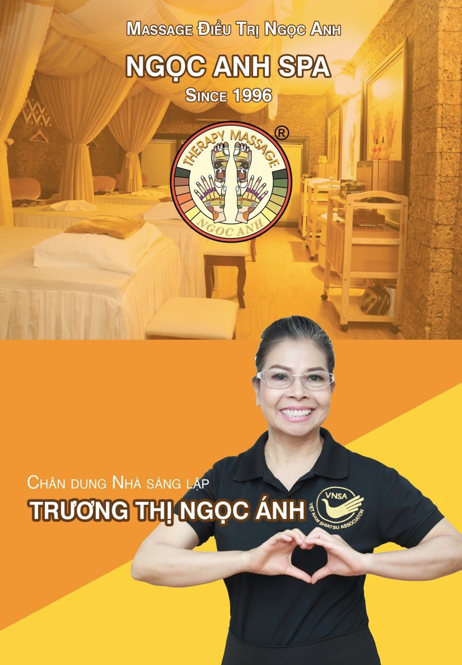 Một thương hiệu được Bà Trương Thị Ngọc Ánh sáng lập năm 1996, tiên phong đi đầu với khái niệm “Massage lành mạnh”. Hơn 26 năm, ôm niềm tin lý tưởng cao đẹp đó, bà một lòng giữ vững thương hiệu là Massage lành mạnh bằng tất cả nỗ lực cống hiến, bằng uy tín của cá nhân mình.